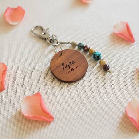 Breloc perfect pentru chei sau alături de o gentuță de umăr, creat din lemn de prun, cu șirag din pietre naturale (japs leopard, agat galben și agat indian, turcoaz). Brelocul este finisat cu ulei de tung și ceruit cu ceară naturală de albine și carnauba. Nuanța lemnului este maronie roșcată, specifică prunului. Carabina și inelul sunt din oțel...