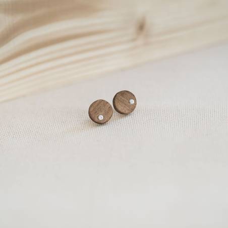 Cercei eleganți din lemn masiv de nuc, finisați cu ulei natural de tung și încrustați cu pietricele Swarovski Zirconia - White. Conectează-te la energia naturii și poartă cercei de lemn. Sunt foarte ușori, dimensiunile sunt mici, nuanța este maronie închis, specifică nucului. Tija este din oțel inoxidabil sau argint 925, iar opritorul din silicon.